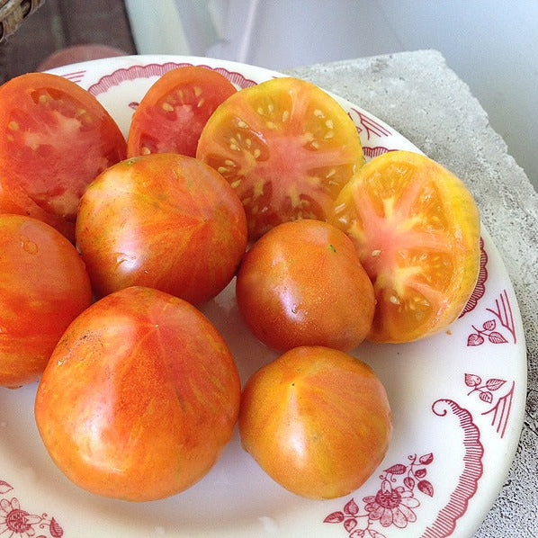 The Gandolf tomato is a dwarf variety known for its variegated foliage and mid-sized, bicolored fruits. It produces golf ball-sized orange/yellow fruits with green stripes and has a mild, sweet flavor.