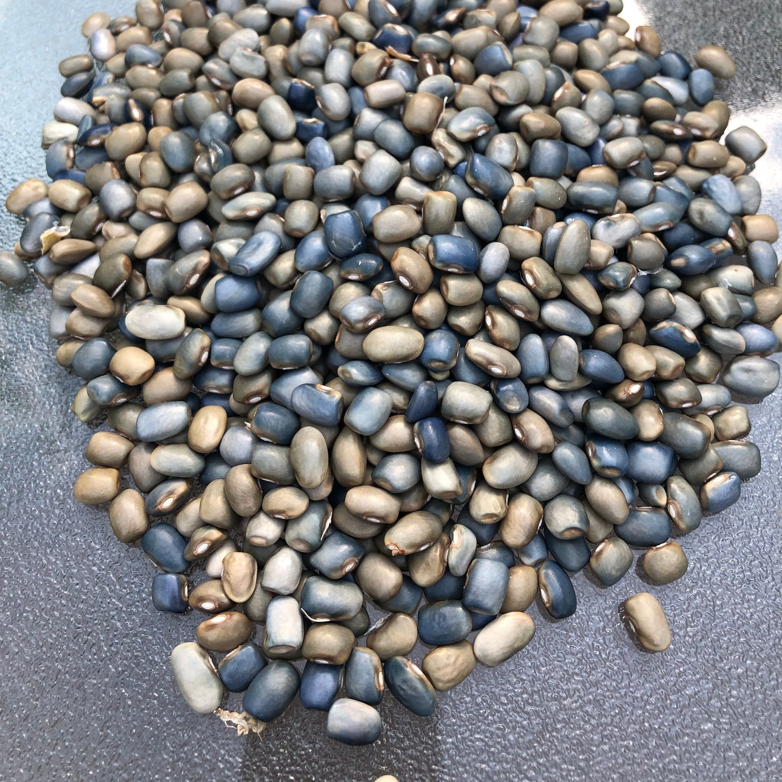The blue pigment is heat sensitive and it degrades when the seeds ripen in hot weather, so seeds that ripen during the heat of the summer will be more of a steel grey while those that ripen during cooler weather heading into fall will be a gorgeous sapphire blue. The color is most vivid when the beans are fresh (like Lisa Bloodnick's 'Sacre Bleu' bean, they darken as they age). Very striking. Even the purple flowers are pretty. This is a vigorous pole type, so be sure yo have a good trellis.